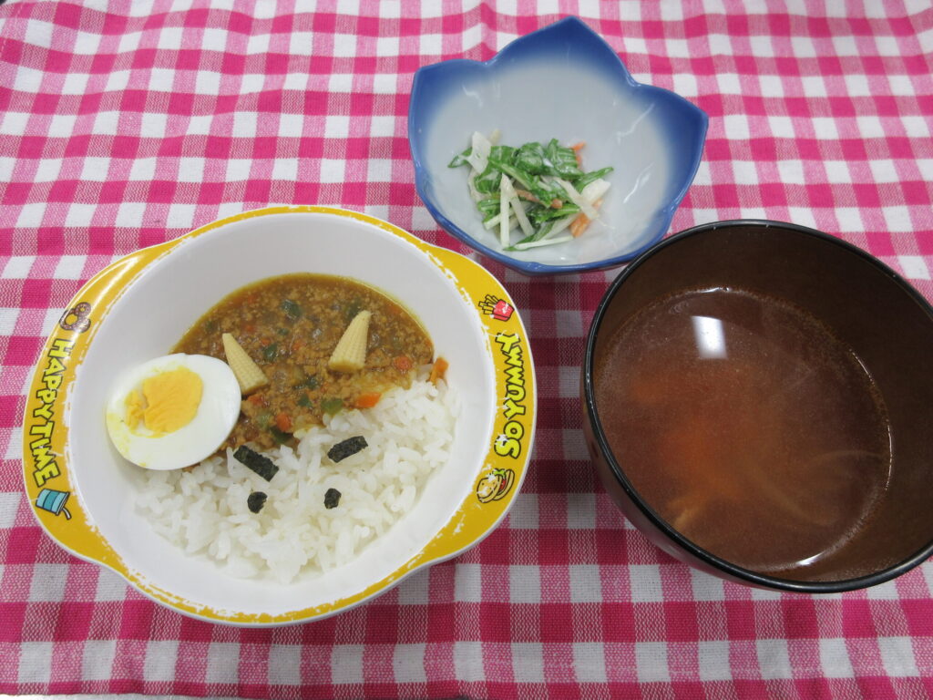 お昼ごはん。園内に残っている幼児さんはオニさんカレーを食べました。